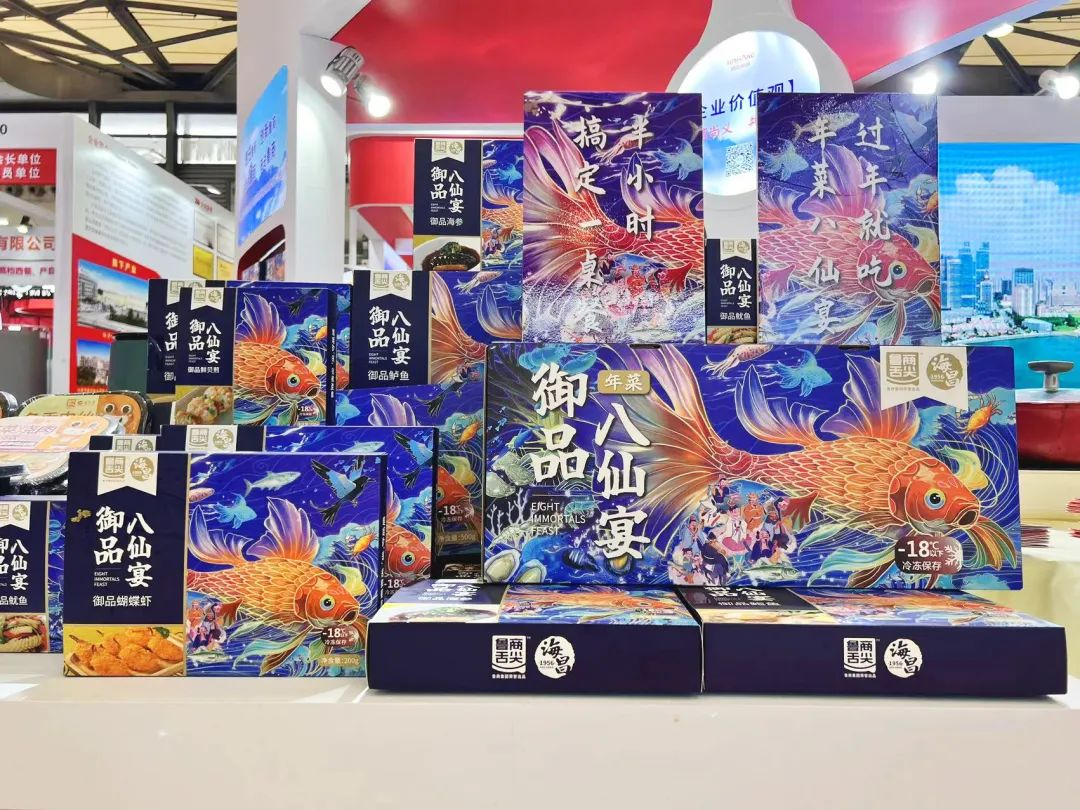 會上展出了棗莊辣子雞、鮮香烤鱸魚、堅果酸奶土豆泥、自熱蓋澆飯等“魯商舌尖”特色產品,特別是與山東城市服務職院聯合開發的“年菜御品八仙宴”系列產品在展會上一經亮相,便吸引眾多中外客商駐足了解品鑒。