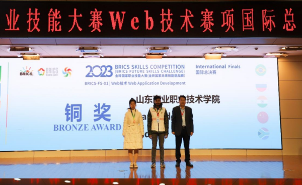 12月1日至3日,2023金磚國家職業技能大賽Web技術賽項國際總決賽舉行,來自金磚五國及孟加拉國、巴基斯坦等10國的線上線下共309支參賽隊伍參加此次比賽。經過激烈角逐,山東商職學院云計算技術與應用產業學院學生張可欣獲總決賽國內一等獎,指導老師薛現偉獲優秀指導專家獎,山東商職學院獲參賽國銅獎。