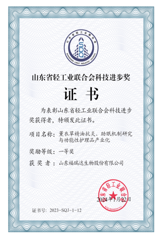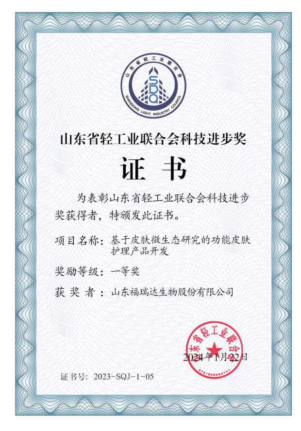 近日,省輕工業(yè)聯(lián)合會發(fā)布《關(guān)于2023年度山東省輕工業(yè)聯(lián)合會科學(xué)技術(shù)獎勵的決定》,福瑞達(dá)生物申報的“基于皮膚微生態(tài)研究的功能皮膚護(hù)理產(chǎn)品開發(fā)”“薰衣草精油抗炎、助眠機(jī)制研究與功能性護(hù)理品產(chǎn)業(yè)化”兩個項目榮獲2023年度山東省輕工業(yè)聯(lián)合會科技進(jìn)步獎一等獎。