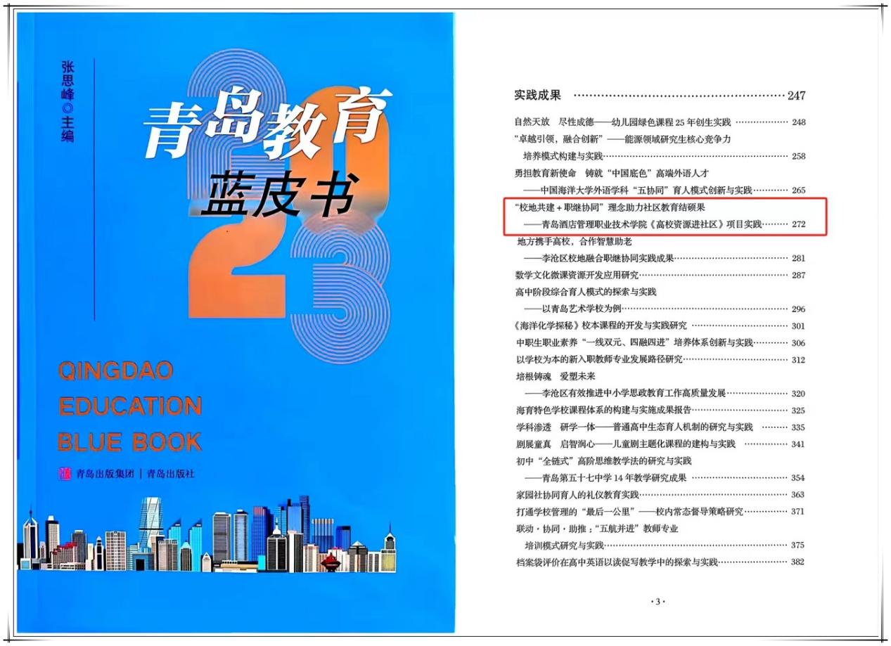近日,《青島教育藍皮書(2023年)》出版發行,青島酒店管理職院繼續教育學院社區教育實踐成果《“校地共建+職繼協同”理念助力社區教育結碩果——青島酒店管理職業技術學院“高校資源進社區”項目實踐》入選。