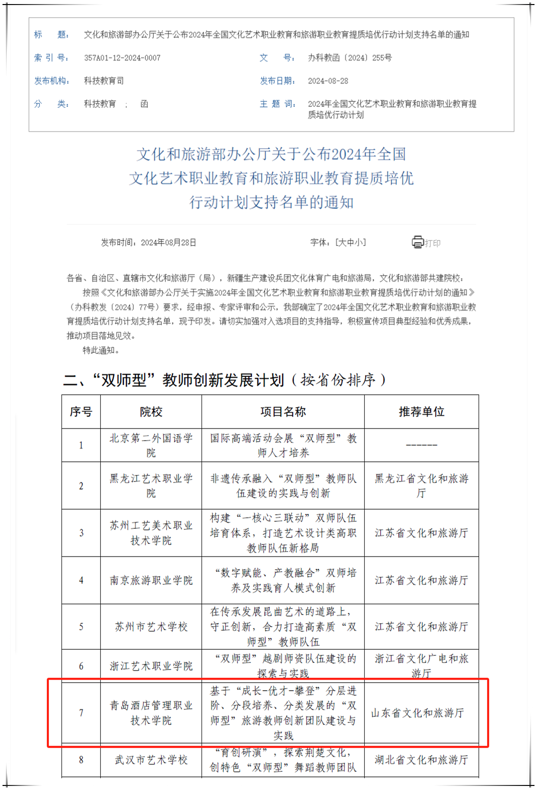 8月28日,文化和旅游部公布了2024年全國文化藝術職業教育和旅游職業教育提質培優行動計劃支持名單,由青島酒店管理職院提報的《基于“成長-優才-攀登”分層進階、分段培養、分類發展的“雙師型”旅游教師創新團隊建設與實踐》項目入選本年度“雙師型”教師創新發展計劃。