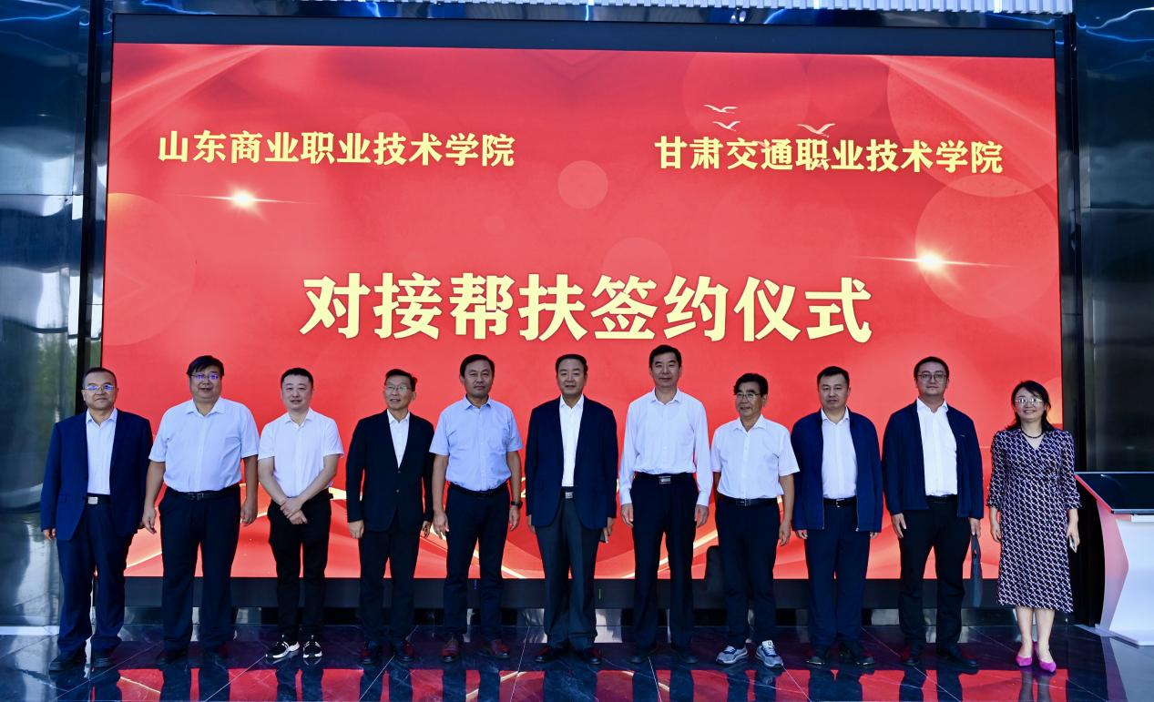 在山東商職學院,張世珍一行參觀了產業會客廳、智慧冷鏈物流實訓基地、文化創意產業學院實訓基地,了解學校辦學理念、辦學特色,以及學校在校企共同體建設、教育教學、專業發展與服務社會等方面的情況。隨后,山東商職學院與甘肅交通職業技術學院簽署了對接幫扶協議,兩校將發揮各自優勢,實現資源共享、優勢互補,共同推動物流類專業(專業群)職業教育發展。