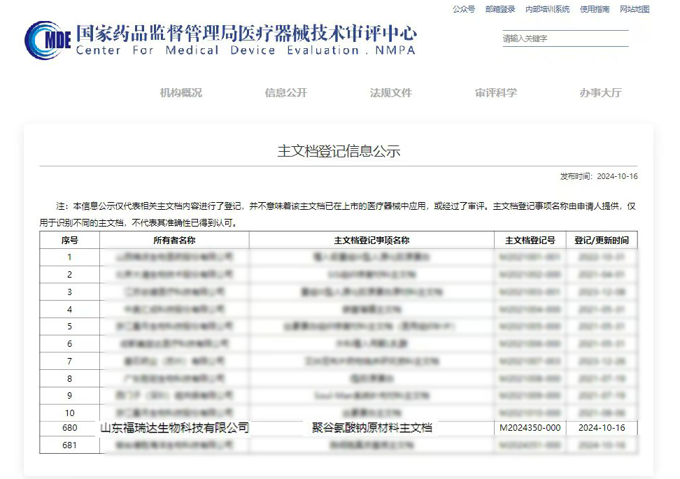 近日,國家藥品監督管理局醫療器械技術審評中心官網公示,福瑞達生物科技自主研發的醫療器械用聚谷氨酸鈉成功通過主文檔備案,成為國內第一家完成該類產品主文檔備案的企業。