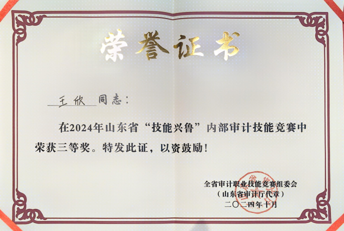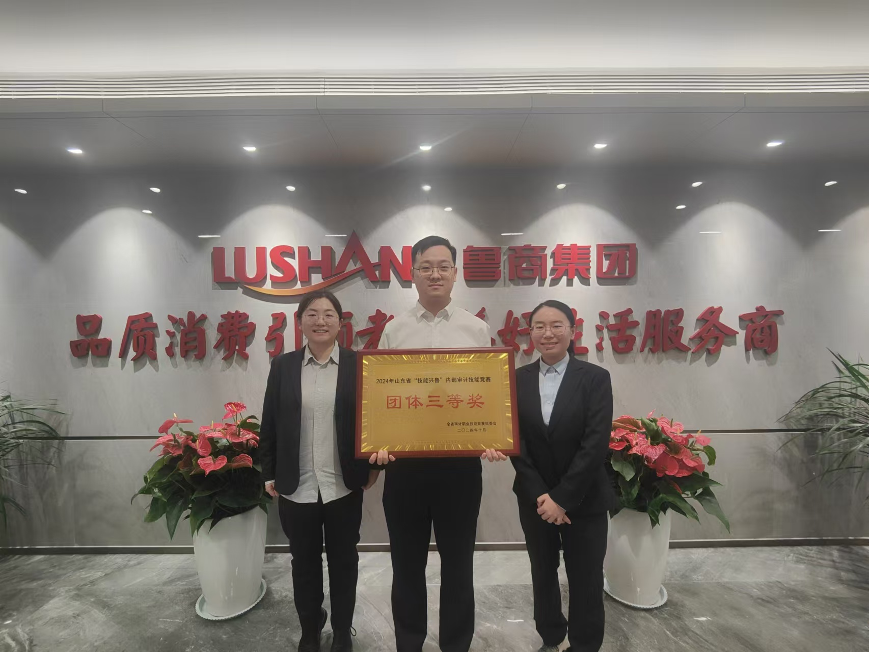 近日,全省內部審計工作會議在濟南召開,會上通報了山東省“技能興魯”2024年全省審計職業技能競賽獲獎名單。魯商集團王欣、張芮、苗楓琳參加了本次競賽并榮獲了團體三等獎,王欣榮獲個人三等獎。