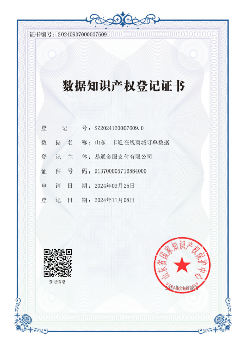 本次入表的“山東一卡通在線商城訂單數據”基于公司權屬單位易通金服沉淀的海量平臺運營數據,魯商科技通過深度清洗加工、合規確權、質量評價等,形成高質量數據集,并順利獲得數據資源、數據資產、數據知識產權3類登記證書。