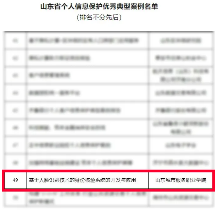 近日,山東省個(gè)人信息保護(hù)優(yōu)秀典型案例名單公布,山東城市服務(wù)職院“基于人臉識(shí)別技術(shù)的身份核驗(yàn)系統(tǒng)的開(kāi)發(fā)與應(yīng)用”案例成功入選。