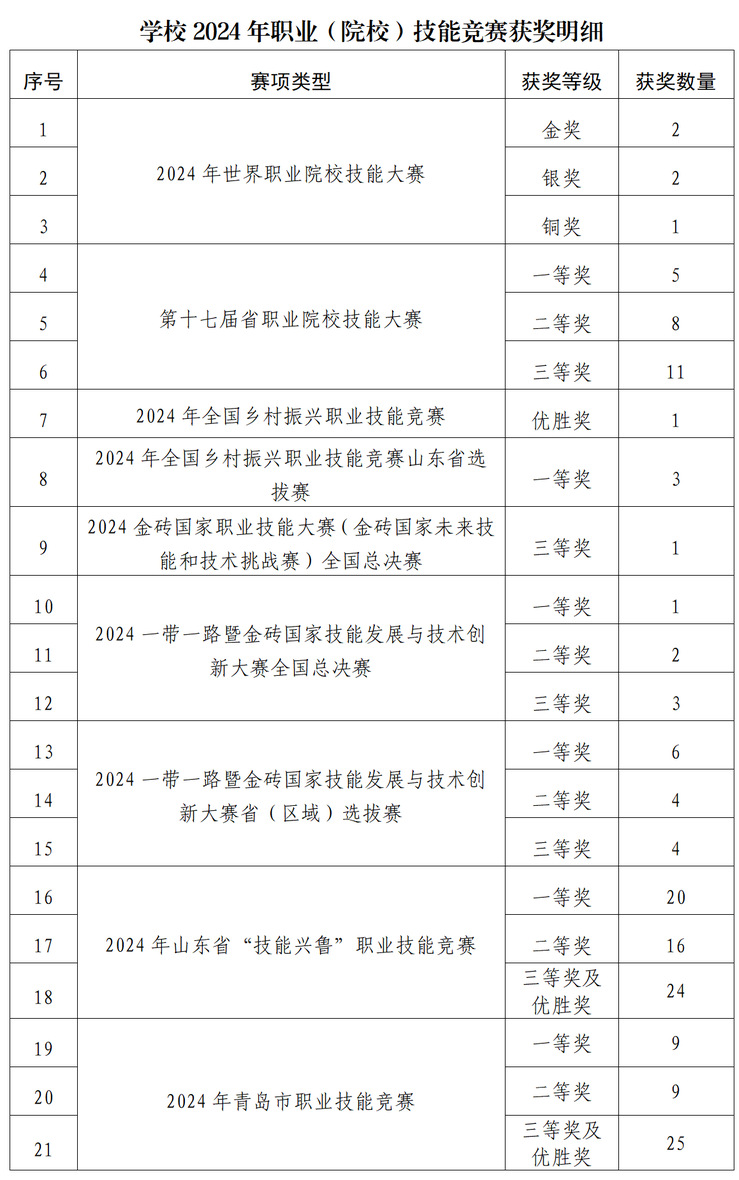 在2024年山東省“技能興魯”職業技能競賽中,學校師生獲一等獎20項、二等獎16項、三等獎及優秀獎24項。在青島市第十七屆職業技能競賽中獲一等獎或金獎9項、二等獎或銀獎9項、三等獎及優勝獎25項。另外,學校師生在山東省大學生科技節、海峽兩岸職業院校技能競賽、各類國家級協會組織主辦的技能競賽等省級以上賽項中獲獎100余項。