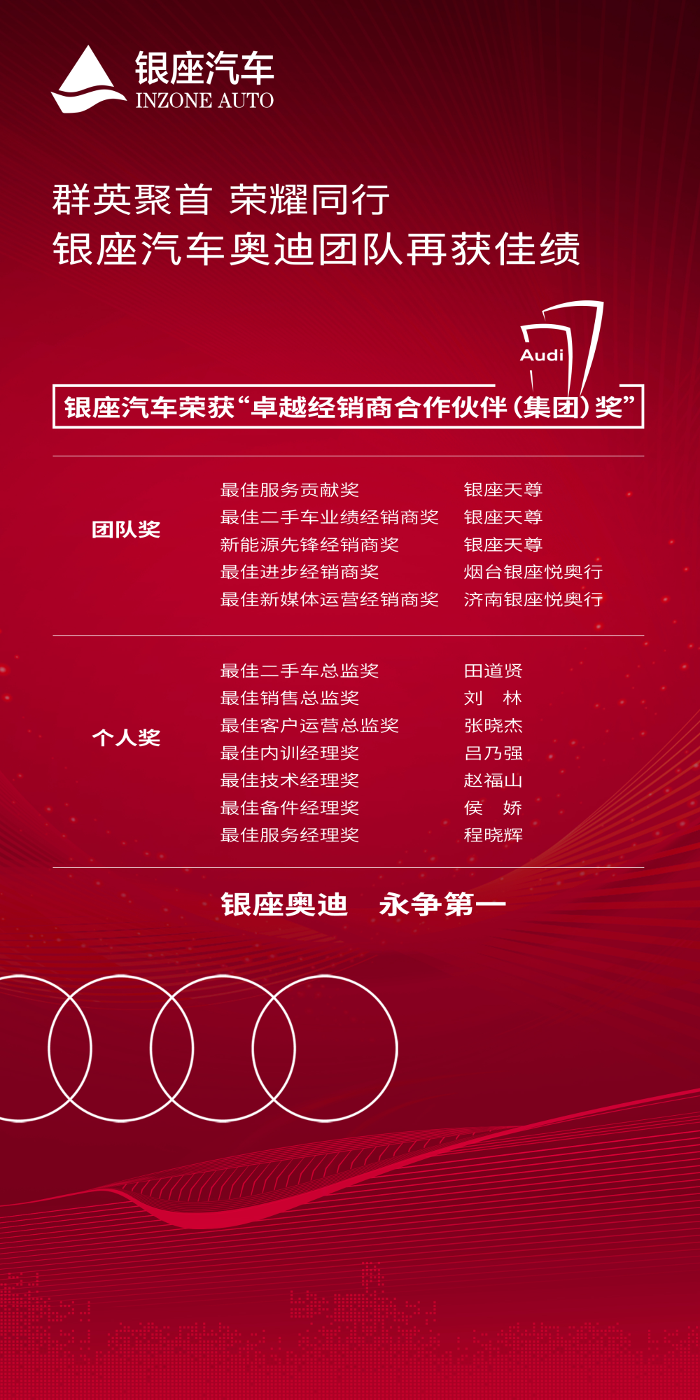 近日,在一汽奧迪特許經銷商品牌體驗日和2025一汽奧迪東北區特許經銷商年會上,銀座汽車及旗下公司獲一汽奧迪卓越經銷商合作伙伴(集團)獎、最佳服務貢獻獎、最佳二手車業績經銷商獎、新能源先鋒經銷商獎、區域最佳進步經銷商獎、最佳新媒體運營經銷商獎多個獎項,在個人獎項上亦有多項斬獲。