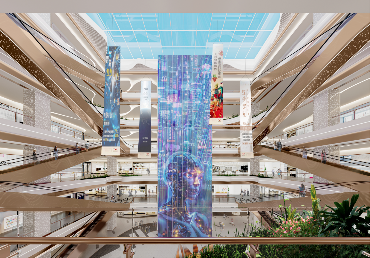 城發設計此次獲獎的濱州銀座茂項目在設計上將“黃河密碼”可視化,中庭高達12米的挑空扶梯集群,巧妙構筑出“河流渦旋”的獨特景觀,陽極氧化鋁板上鐫刻的黃河水文數據,無聲訴說著黃河千年的奔騰故事。沙洲形狀的休息區融入本土非遺草編技藝的曲面模塊,每一處細節都散發著濃郁的地方文化氣息。