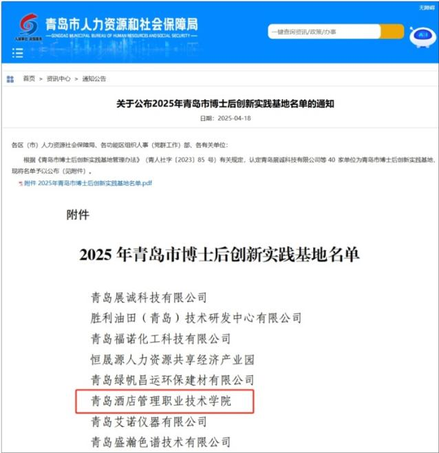 近日,青島市人力資源和社會保障局公布了2025年青島市博士后創(chuàng)新實(shí)踐基地名單,青島酒店管理職院成功獲批,高層次人才載體建設(shè)取得又一重要突破。