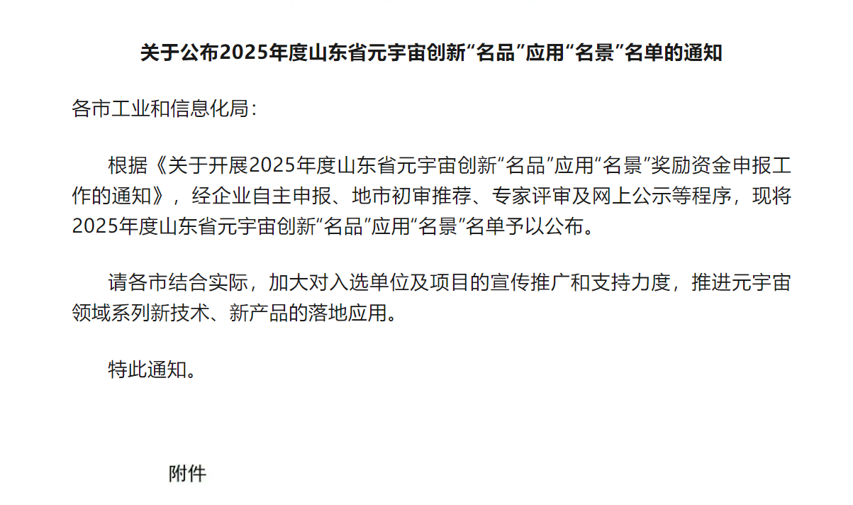 為深化元宇宙與行業領域融合,開發一批元宇宙內容產品和服務,打造一批元宇宙先鋒應用場景,助推元宇宙技術和應用解決方案的落地推廣,山東省工業和信息化廳、山東省財政廳組織開展了2025年度山東省元宇宙創新“名品”應用“名景”項目申報工作。此次評選聚焦元宇宙技術與產業融合的創新性、落地性及示范價值,旨在發掘并推廣一批可復制、可推廣的元宇宙應用標桿。