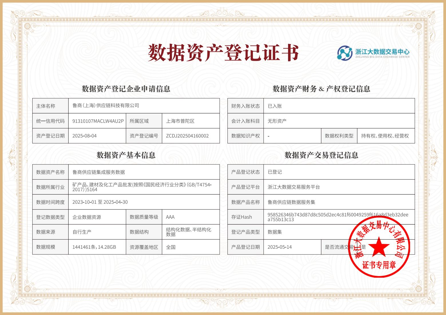 近日,魯商(上海)供應鏈科技有限公司(以下簡稱“上海供應鏈”)數據資產化取得階段性成果,公司整合ERP、外部物流、內部財務、OA等各系統,匯集全球大宗商品市場公開信息,形成了2023年10月1日到2025年4月30日期間的144萬條大宗商品“采購、物流倉儲、銷售”一體化主營業務數據資產,并成功在浙江大數據交易所進行〔魯商供應鏈集成服務數據〕數據資產登記備案,并順利獲頒證書。這不僅是魯商供應鏈在科技數字化轉型征程中的關鍵跨越,更標志著企業在數據規范化管理與價值挖掘、數據可信交易領域邁入全新階段。