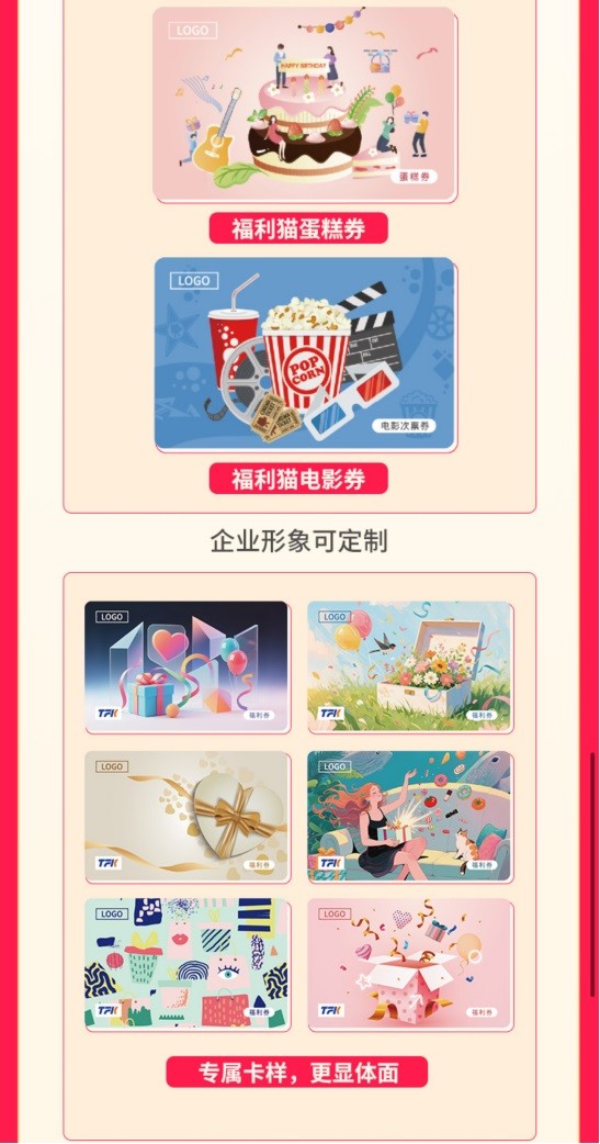 “魯商福利貓”平臺的核心優勢在于其高度的定制化服務。企業可以根據自身需求,定制福利實體卡券的圖案,讓卡券獨具特色,展現企業文化和關懷。平臺還支持定制福利卡券類型,涵蓋提貨券、蛋糕券、電影券等多種類型,滿足員工在不同場景下的消費需求。此外,福利卡金額也可根據企業預算進行靈活定制,實現精準福利分配。