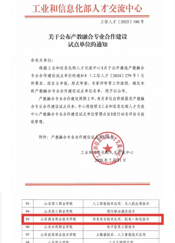 近日,工業和信息化部人才交流中心發布了“產教融合專業合作建設試點單位”名單,山東商職學院信息安全技術應用專業經過層層遴選,成功入選。