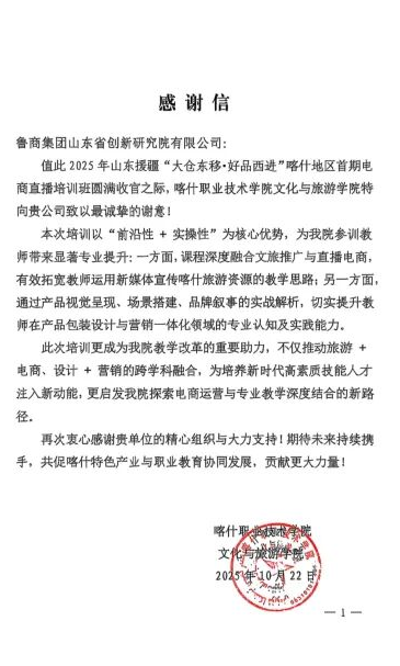 在2025年山東援疆“大倉東移 好品西進”工程深入推進之際,首期電商直播培訓班圓滿結業(yè)。近日,喀什職業(yè)技術學院文化與旅游學院向培訓主承辦單位山東省對口支援新疆工作指揮部、喀什地區(qū)商務局、魯商科技所屬創(chuàng)新研究院有限公司致信感謝,感謝此次培訓提升了學校電商專業(yè)教師提升專業(yè)素養(yǎng)和教學能力。