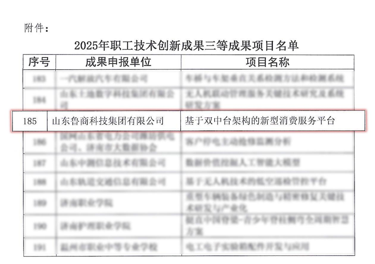 近日,中國職工技術協會公布2025年職工技術創新成果評選結果,魯商科技技術成果成功獲評三等獎。