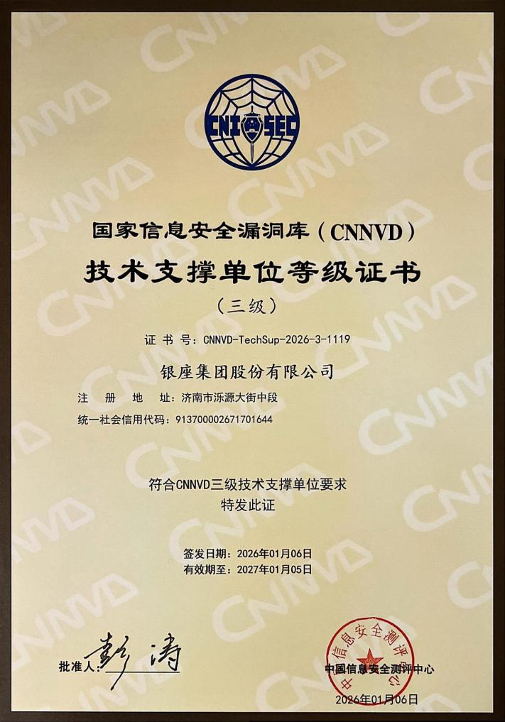 銀座集團獲評國家信息安全漏洞庫(CNNVD)三級技術支撐單位