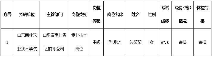 根據《關于做好2021年事業單位公開招聘工作人員有關問題的通知》(魯人社字〔2020〕155號)、《關于進一步優化職業院校公開招聘工作有關問題的通知》(魯人社字〔2020〕80號)等相關規定,按照崗位招聘計劃,山東省商業集團有限公司所屬山東商業職業技術學院組織完成了2021年博士崗位招聘考試、考察、體檢等工作,現對該單位擬聘用人員進行公示。公示期為7個工作日,自2021年12月30日至2022年1月10日(不含節假日)。公示期間,如對公示人選有異議,請及時向山東省商業集團有限公司反映。