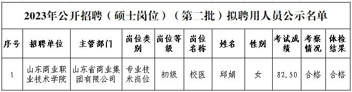 根據(jù)中共山東省委組織部、山東省人力資源和社會(huì)保障廳《關(guān)于印發(fā)2023年度省屬事業(yè)單位公開招聘工作實(shí)施方案的通知》(魯人社發(fā)〔2022〕23號(hào))和省屬事業(yè)單位公開招聘有關(guān)政策規(guī)定,按照崗位招聘計(jì)劃,山東商業(yè)職業(yè)技術(shù)學(xué)院組織完成了2023年公開招聘(碩士崗位)(第二批)工作人員考試、體檢、考察等工作,現(xiàn)對(duì)該單位擬聘用人員進(jìn)行公示。公示期為7個(gè)工作日,自2023年11月23日至2023年12月1日(不含節(jié)假日)。公示期間,如對(duì)公示人員有異議,請(qǐng)向山東省商業(yè)集團(tuán)有限公司組織人力資源部反映。反映問(wèn)題要實(shí)事求是,并告知真實(shí)姓名及聯(lián)系方式。