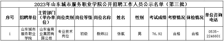 山東城市服務職業學院2023年公開招聘擬聘用人員公示名單(第三批)