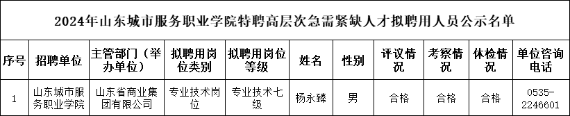 山東城市服務職業學院2024年特聘高層次急需緊缺人才擬聘用人員公示名單