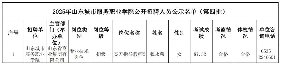 根據(jù)中共山東省委組織部、山東省人力資源和社會保障廳關(guān)于印發(fā)《2025年省屬事業(yè)單位公開招聘工作實施方案的通知》(魯人社發(fā)〔2024〕15號)要求等相關(guān)規(guī)定,山東城市服務(wù)職業(yè)學(xué)院經(jīng)過公開招聘報名、考試、考察、體檢等工作,現(xiàn)對擬聘用人員(第四批)進(jìn)行公示,公示期為5個工作日,自2025年8月5日至2025年8月11日(不含節(jié)假日)。公示期間,如對公示人選有異議,請及時向山東省商業(yè)集團(tuán)有限公司反映。