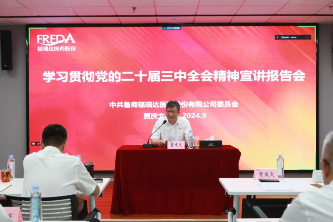 報(bào)告會(huì)上,賈慶文緊緊圍繞習(xí)近平總書記在黨的二十屆三中全會(huì)上的重要講話精神和全會(huì)《決定》,對(duì)全會(huì)的基本情況,以及深刻認(rèn)識(shí)進(jìn)一步全面深化改革、推進(jìn)中國(guó)式現(xiàn)代化的重大意義和總體要求等進(jìn)行全面系統(tǒng)解讀,對(duì)《決定》提出的進(jìn)一步全面深化改革重大舉措,尤其是國(guó)資國(guó)企改革舉措進(jìn)行深入闡釋,并結(jié)合福瑞達(dá)實(shí)際,就抓好全會(huì)精神學(xué)習(xí)貫徹、推動(dòng)改革舉措落實(shí)落地作出安排部署。